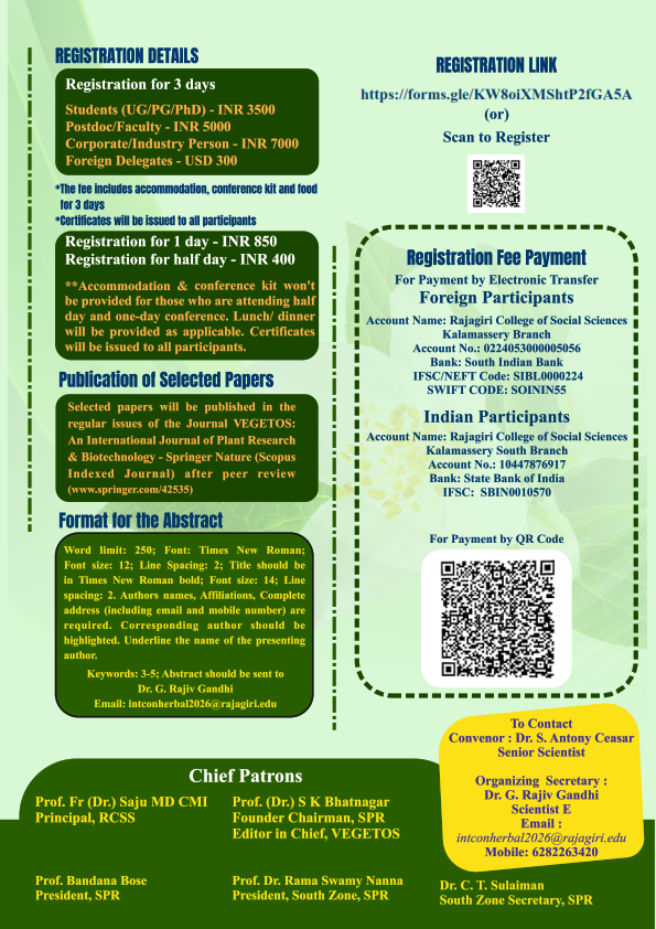 Dr. G. Rajiv Gandhi; email: intconherbal2026@rajagiri.edu, Mobile: 6282263420